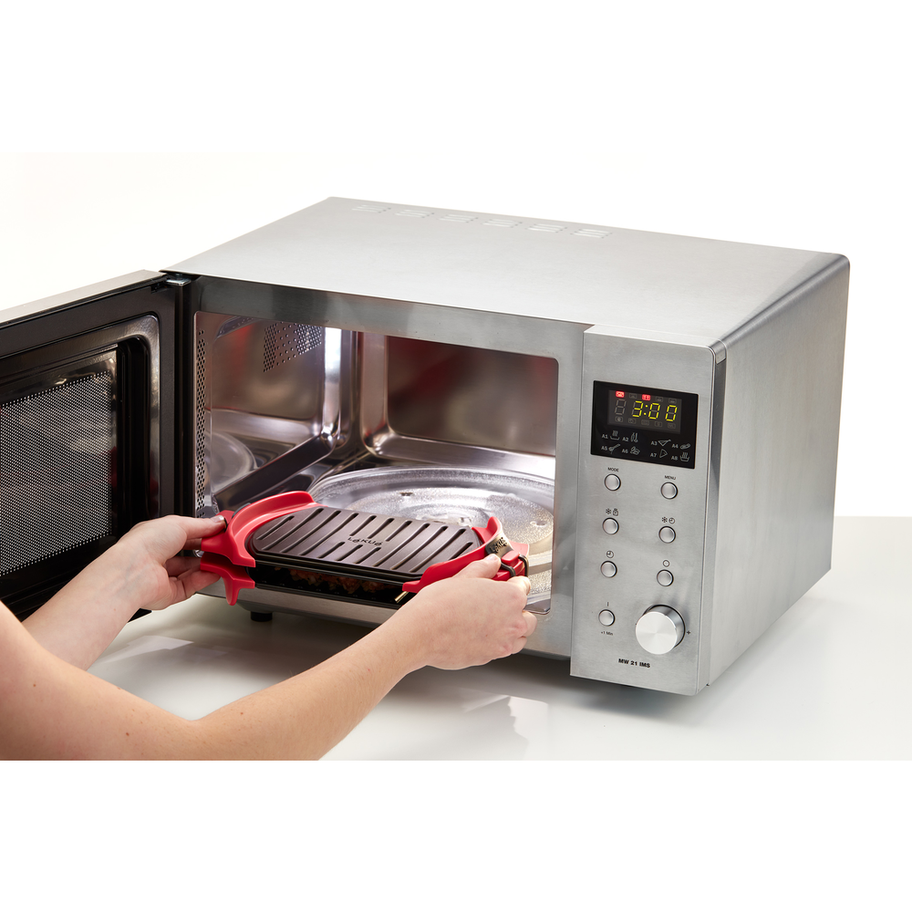 ¡Sencillo, rápido y limpio con un resultado delicioso de parrilla! Podrás cocinar de forma sana diferentes alimentos con efecto grill y conseguir un resultado crujiente; prepara carnes, verduras, sándwiches, cocas, pizzas… a la velocidad del microondas, en solo unos minutos, manteniendo todo su sabor y calidad.La forma más fácil de preparar alimentos al grill en casa, ahora en versión XL.Una cocción más sana: 1: Evita la saturación de grasas: no se superan los 240ºC en el proceso de cocción. 2: Mantiene las propiedades del aceite y de los alimentos. 3: Cocina con menos aceite.¡Sin humo ni olores! Fácil limpieza, a mano y en el lavavajillas.Podrás preparar de 3 a 4 raciones gracias a esta nueva versión más grande, que cuenta con un 60% más de superficie útil que el Microwave Grill original (1-2p).