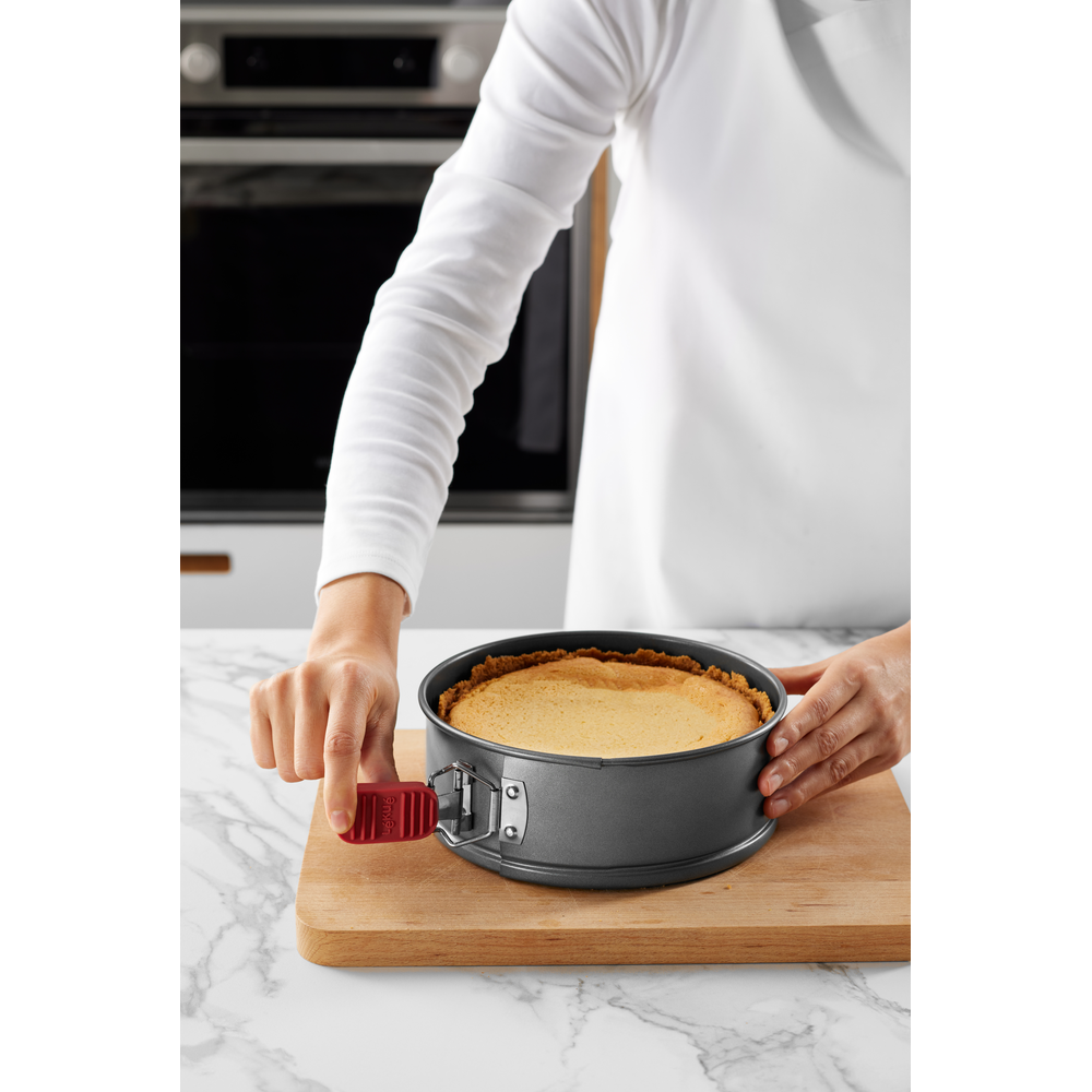 - Con su reconocida comodidad y practicidad, este molde para pasteles cuenta con un mango de Silicona Platino para una fácil apertura sin dañar tus preparaciones, permitiéndote decorarlas o servirlas al instante.