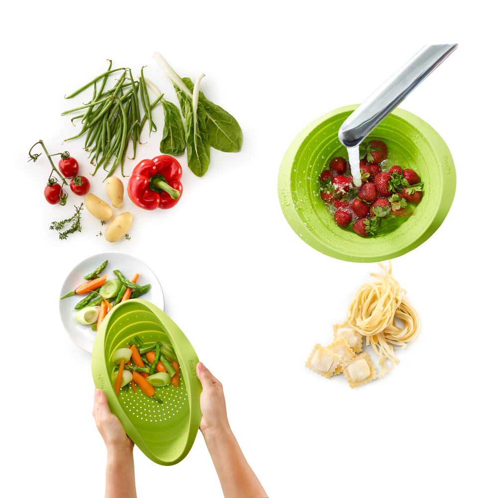 Escurrir, enjuagar, lavar fruta, pasta o verdura será una tarea más sencilla y cómoda con el escurridor pleglable Lékué.