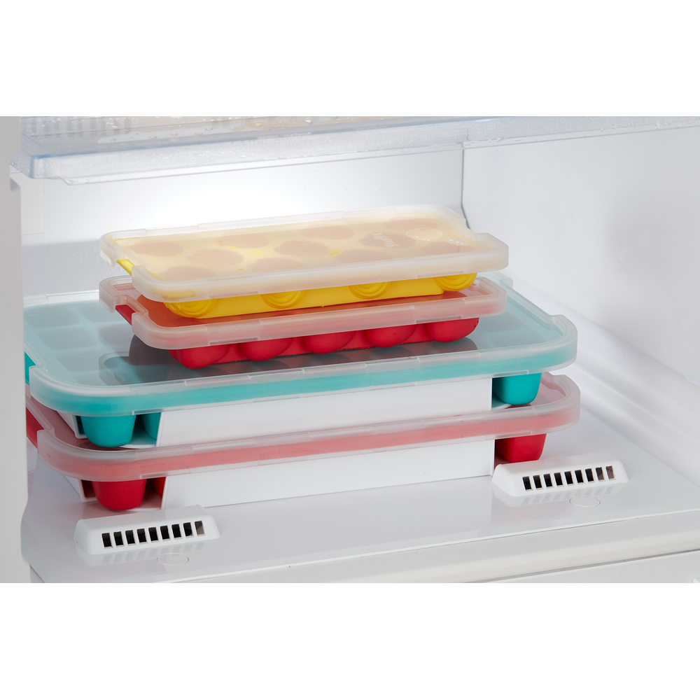 • Incluye una tapa que evita que los olores los alimentos del congelador se transfieran a los cubitos de hielo. También permite apilar las cubiteras y otros recipientes optimizando el espacio de almacenaje. Podrás mover la cubitera y colocarla en los cajones del congelador de una forma estable, evitando escapes de agua.