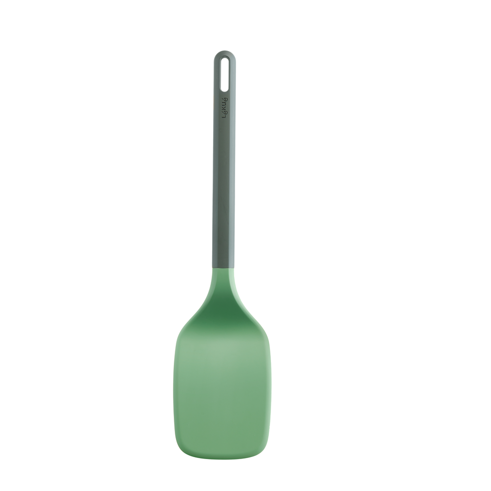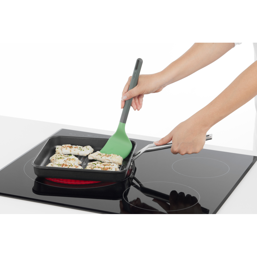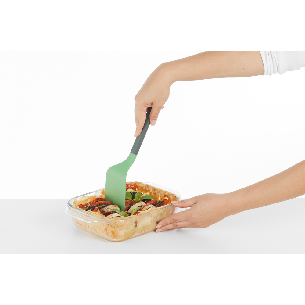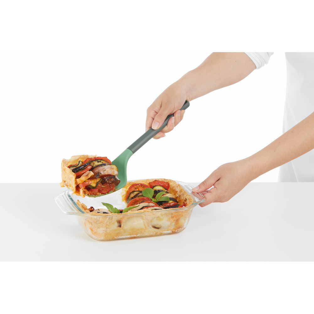 Espátula de cocina perfecta para servir y racionar los alimentos de forma segura y eficaz. Su cabezal de gran tamaño, recubierto de silicona flexible, es más flexible y resistente a temperaturas de hasta 220 ºC.